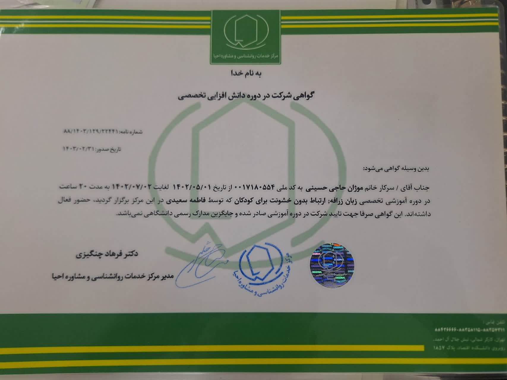 • پروانه اشتغال 21313 | سازمان نظام روانشناسی