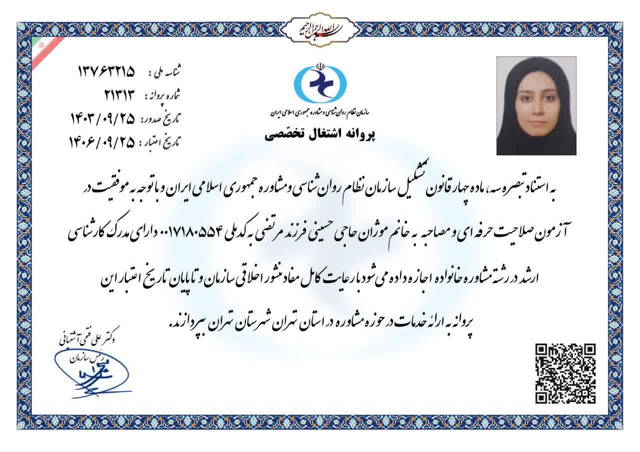 دکتر موژان حاجی‌حسینی، دارای مدرک دکتری تخصصی مشاوره از دانشگاه تهران و عضو سازمان نظام روانشناسی و مشاوره (شماره پروانه ۲۱۳۱۳)، یک متخصص متعهد در حوزه سلامت روان کودک و نوجوان است. او روانشناسی را نه فقط یک شغل، بلکه مأموریتی برای بازگرداندن آرامش به دنیای پرهیاهوی کودکان و نوجوانان می‌داند.